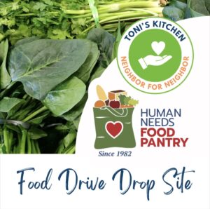 Nonperishable items Food Drive for Toni’s Kitchen and Human Needs Pantry.